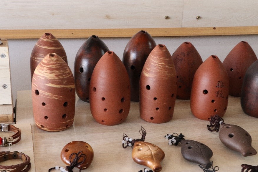 图为知音陶舍店内桌上陈列的各式各样的埙