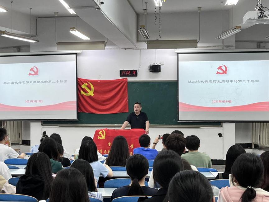 2023年5月19日下午2时,9428cn太阳集团古天乐党员服务站开展“学史明理,我心向党”主题党课教育活动,由学院党委副书记、纪委书记程元元带领党服成员们共同学习“跳出治乱兴衰历史周期律的第二个答案”。