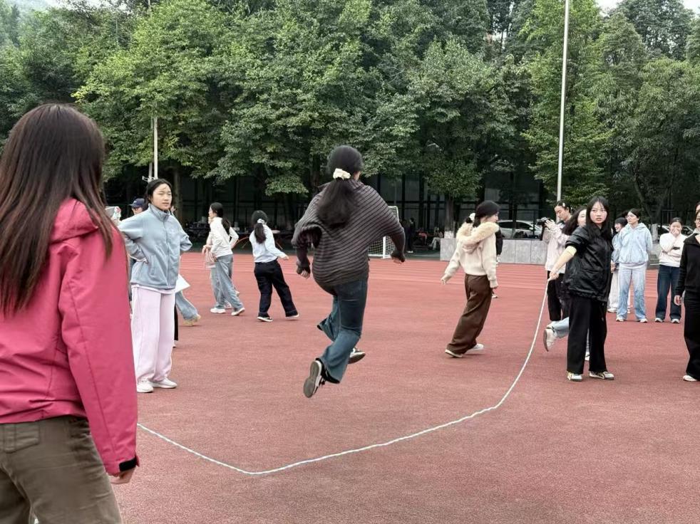 塑胶跑道上,“8”字跳绳比赛正激情开展。同学们心连心、排成排,在跳绳上“翻飞起舞”,每一次跳跃都谱写了团结与奋进的青春乐章。