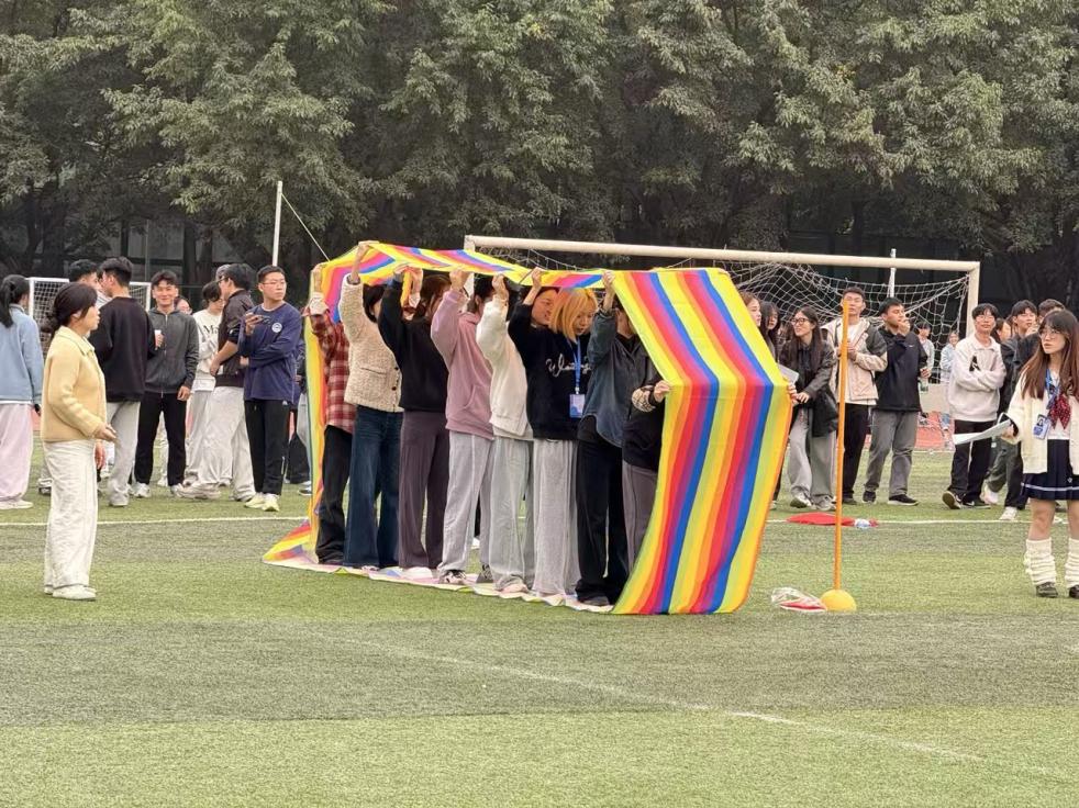在绿意盎然的运动场上,一场活力满满的 “无敌风火轮” 竞赛正热烈上演。彩色的布条如彩虹般交织成圆筒,队员们穿梭其中、紧密协作,以整齐划一的“脚力”和“眼力”推动“风火轮”向前滚动。赛场上洋溢着喜悦,每一次跨步、每一滴汗水都凝聚着“文新学子”的智慧与力量,成为校园里一道亮丽的“风景线”。
