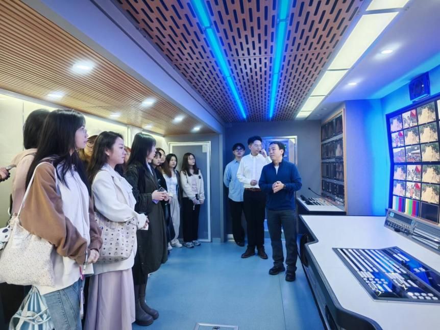 在巴南融媒体中心,学生实地探访了电视转播车、监听监控室、广播直播间、新闻直播间等地。他们与一线工作人员进行了热烈的交流,从而深入洞察了媒体运作的各个环节,对媒体行业的实际工作流程有了更为直观和全面的认识。