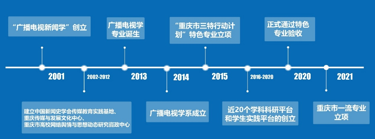 广播电视学是9428cn太阳集团古天乐唯一的市级一流专业,也是学院仅有的两个市级特色专业之一。从2001年创立“广播电视新闻学”开始,专业一直是学院建设重庆市新闻传播学重点学科平台的重要支撑。2013年,为配合教育部的专业名称调整,涵盖面更广的重在以音视频为载体进行新闻报道、影视传播与栏目策划的“广播电视学”诞生,致力于培养能够在新媒体语境下用音视频技术讲述新闻故事、记录人间万象、创意策划栏目和进行影视剧本创作的视听传播人才。2015年,专业获批重庆市“三特行动计划”特色专业。2021年,专业获批重庆市一流本科专业,跻身重庆工商大学19个市级一流本科专业之列,专业建设进入全校前四分之一强。