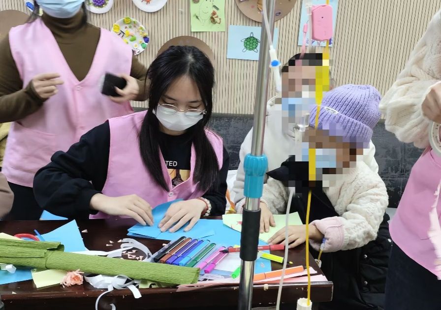 在重庆医科大学附属医院儿童医院(渝中区本部),志愿者们带领肿瘤外科住院治疗的小朋友制作手工,活动开始之前,志愿者们认真细致地对活动地点和物品进行了清洁消毒,以保障孩子们的健康安全;活动中,志愿者们耐心细致地给孩子们讲解手工制作的方法,鼓励孩子们大胆地尝试自己创作,用亲切的笑容和温柔的言语为孩子们传递着关爱,温馨的陪伴为孩子们枯燥的住院治疗生活添上了亮丽的色彩。