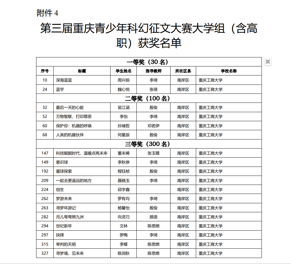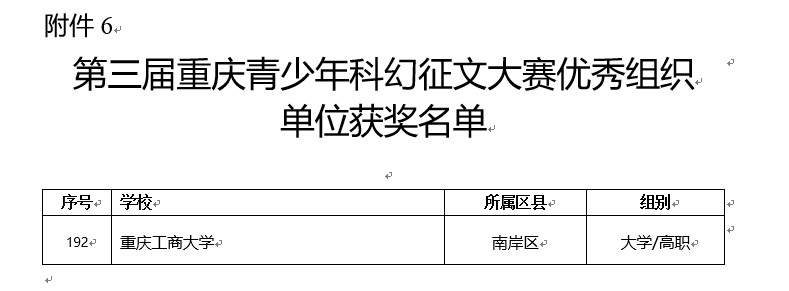 上图:我校参加第三届重庆青少年科幻征文大赛大学组获奖名单