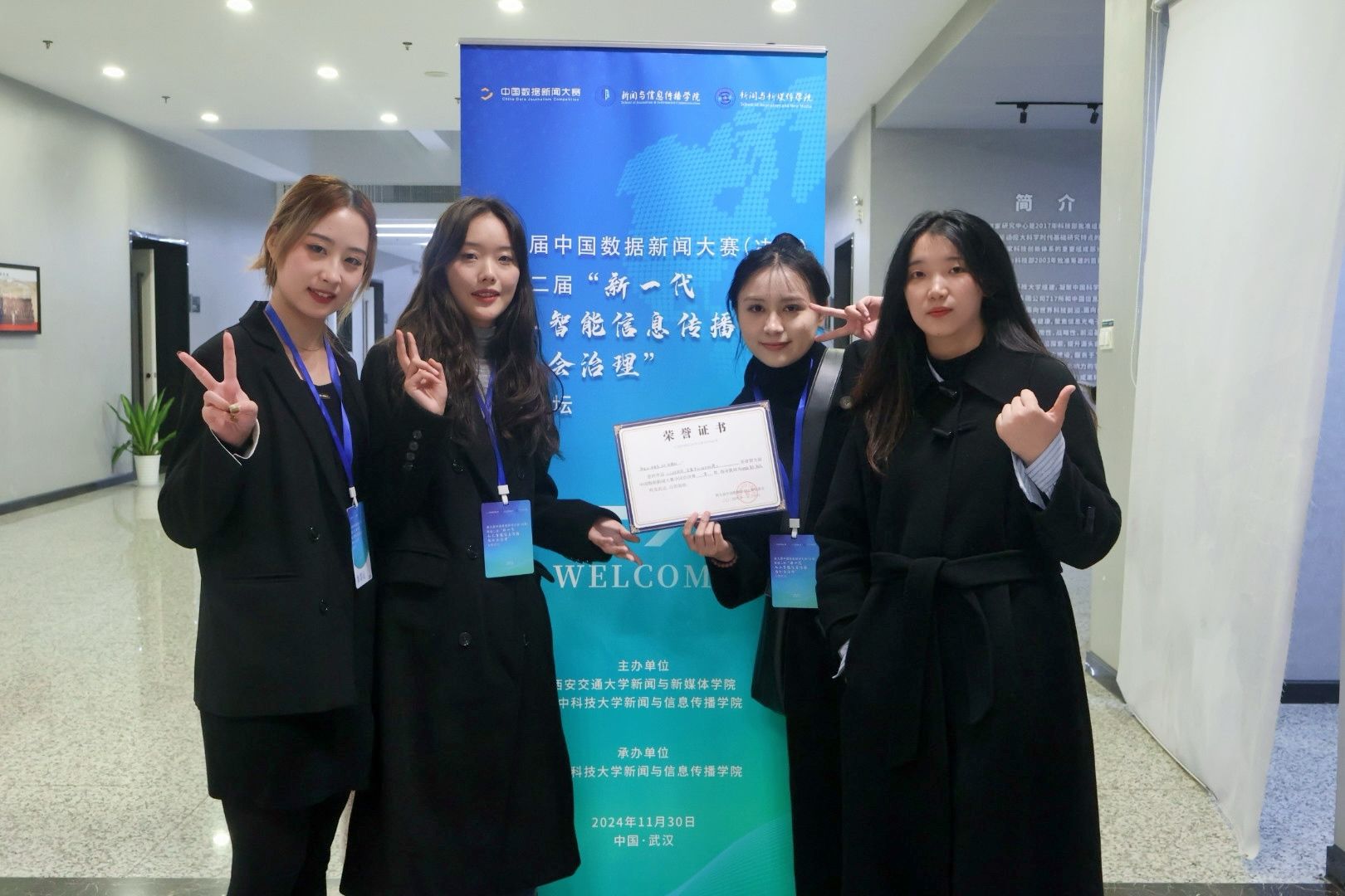11月30日,第九届中国数据新闻大赛(全国总决赛)暨第二届“新一代人工智能信息传播与社会治理”主题论坛在华中科技大学隆重举办。9428cn太阳集团古天乐2023级研究生韩金汝、古乔、周紫莹、钟静怡四位学子所组成的队伍参加中国数据新闻大赛,并荣获全国总决赛一等奖。