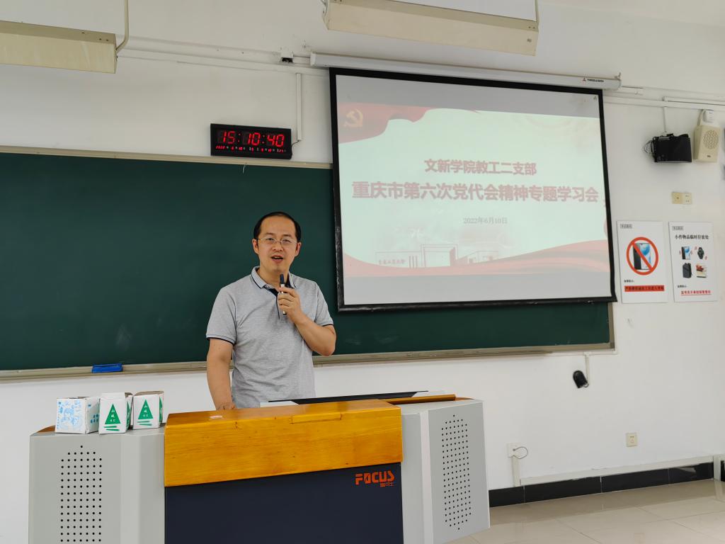 6月10日下午,我院教工第二党支部在90624教室召开重庆市第六次党代会精神专题学习会,支部书记邵茹波领学了市委书记陈敏尔所做的《沿着习近平总书记指引的方向坚定前行 推动高质量发展 创造高品质生活 奋力书写重庆 全面建设社会主义现代化新篇章——在中国共产党重庆市第六次代表大会上的报告》。