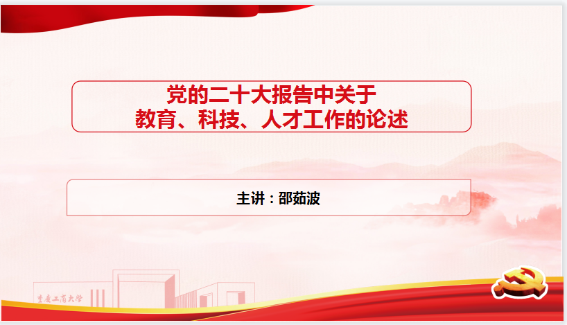 邵茹波主讲的题目为《党的二十大报告中关于教育、科技、人才工作的论述》。他讲道:党的二十大报告的第五部分“实施科教兴国战略,强化现代化建设人才支撑”,是关于教育、科技、人才工作的发展部署。这一部分先是通过三个“第一”、三个“战略”、四个“新”等论述来阐述这些工作的发展总方针,通过三个“强国”等论述来阐述这些工作的发展总目标;然后进行分论,分别提出了教育、科技、人才工作的发展方针和发展目标。总之,“教育、科技、人才是全面建设社会主义现代化国家的基础性、战略性支撑。”