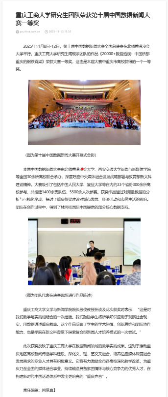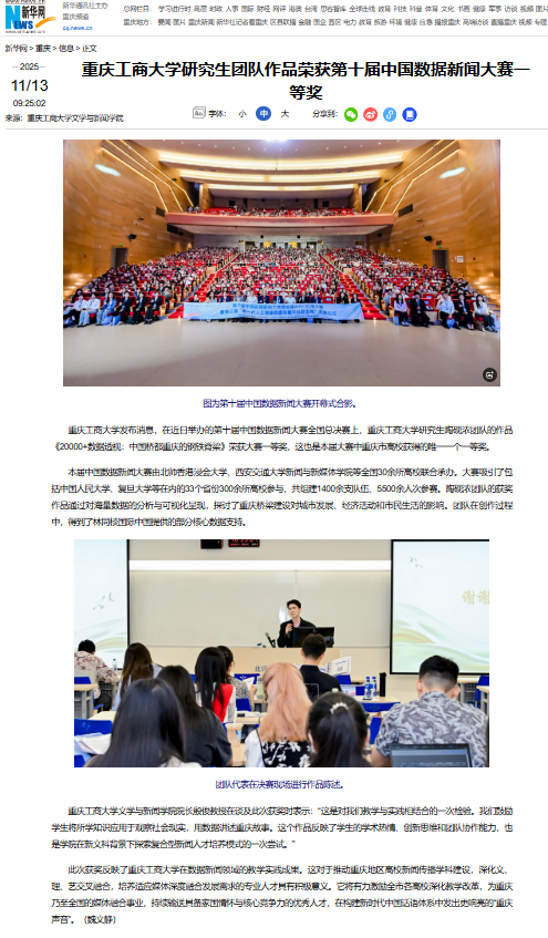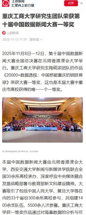 上游新闻、中国网、新华网以《重庆工商大学研究生团队荣获第十届中国数据新闻大赛一等奖》对此进行报道。