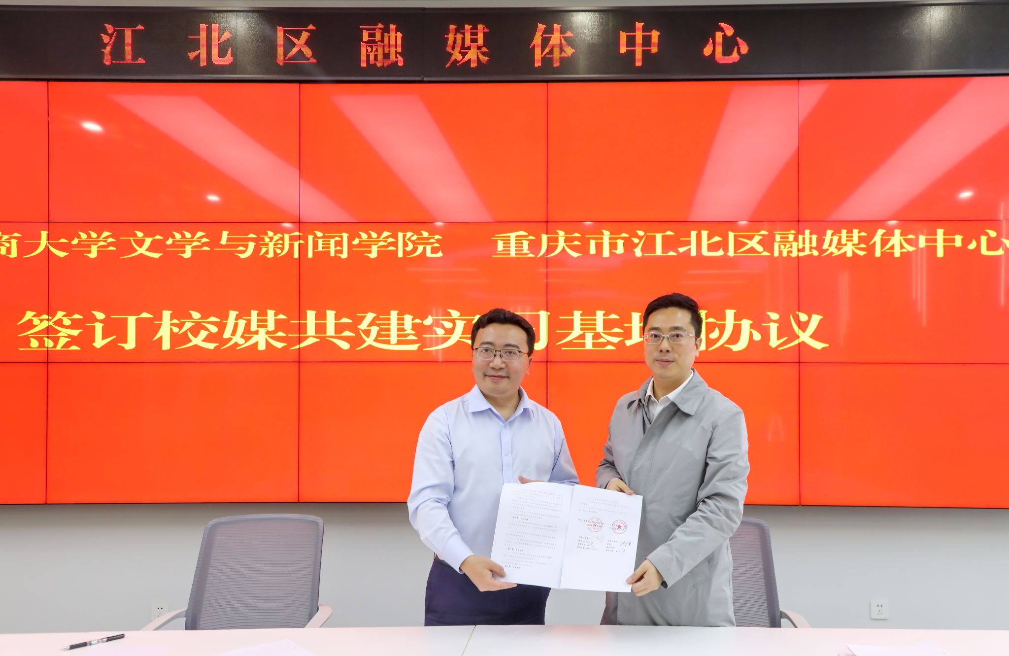 4月23日,殷俊、汉文系系主任周之涵、广告系教师王凌峰一行到江北区融媒体中心开展“访企拓岗促就业”洽谈交流暨实习实践基地签约活动。
