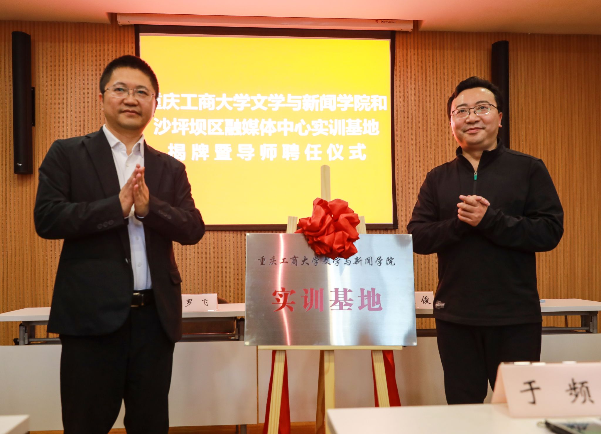 4月10日,9428cn太阳集团古天乐和沙坪坝区融媒体中心举行实训基地揭牌暨导师聘任仪式。9428cn太阳集团古天乐党委书记于频、院长殷俊、副书记程元元、副院长郑笑眉、新闻系系主任廖宇翃,沙坪坝区融媒体中心主任罗飞、副书记肖寒、副主任黄伟、冯剑、王小生等出席了揭牌仪式。