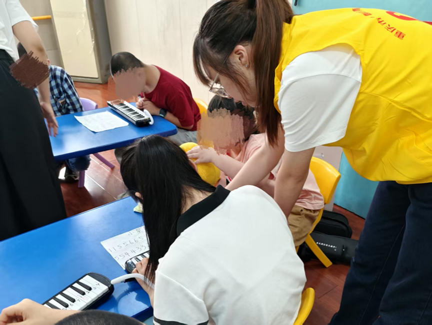 与此同时,启明星儿童康复中心的活动室里正上演着别样的温情画面。志愿者们以“影子老师”的身份嵌入教学体系,配合机构教师开展育人工作。音乐课上,志愿者采用“手把手辅助”加“点对点指导”的教学策略帮助孩子们完成了人生中的第一次演唱和弹奏;在语言训练环节中,志愿者们化身“图卡交换师”,用图画和印有图案的卡片引导孩子们“听、说、读、写”,将抽象的语言指令转化为可视化互动。在志愿者们的耐心引导下,孩子们积极参与课堂活动,课堂互动氛围良好。课程结束后,志愿者还与孩子们共同完成了教学用具的收纳整理,培养了孩子们的动手能力与实践意识。