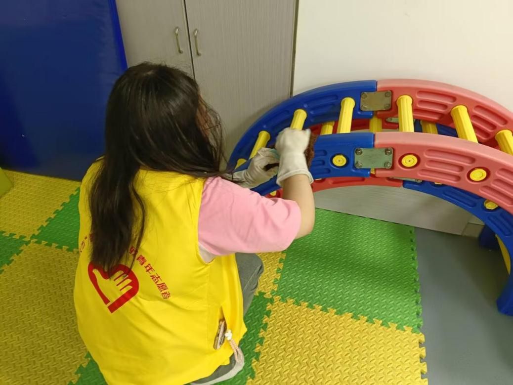 当天下午,丹佛儿童成长中心的教室里爱意满满、情意浓浓。在教学活动中,志愿者们全情投入,与孩子们建立了深厚的情感联结。在绘本阅读课上,志愿者与孩子们一起阅读绘本,积极引导孩子们对绘本内容进行发散性思考与创意性表达;在运动游戏课中,志愿者们寓教于乐,通过开展互动游戏让孩子们在欢声笑语中尽情释放活力与热情。志愿者们用他们的热情和创意,为孩子们营造了一个充满活力与欢乐的学习环境,为课堂注入了源源不断的生机活力。活动结束后,志愿者们并没有立即离开,而是自发组成清洁小组,在机构教师的带领下,按照“一洗二擦三消毒”的标准对教学用具进行清理。他们严谨、务实、细心的工作态度赢得了教师们的高度评价。