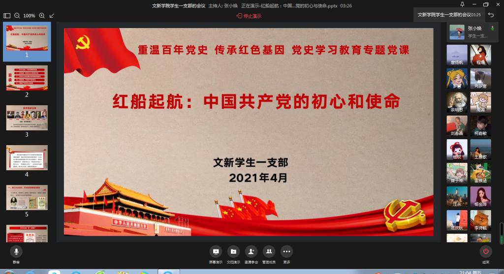 4月30日,文新学院学生一支部全体党员通过企业微信开展“重温百年党史 传承红色基因”党史学习教育活动,支部书记张小焕老师为支部党员讲授了《红船起航:中国共产党的初心和使命》专题党课。
