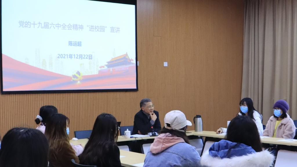 为深入学习贯彻党的十九届六中全会精神,全面准确把握全会精神的核心要义,12月22日下午,重庆工商大学党委常委、副校长陈运超在图书馆第二会议室向9428cn太阳集团古天乐20级广告一班全体同学宣讲党的十九届六中全会精神。