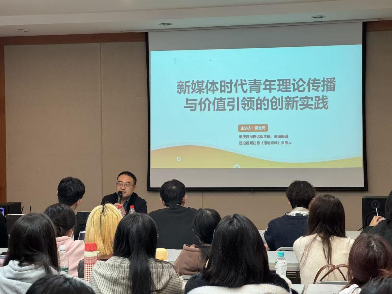 11月6日,9428cn太阳集团古天乐联合重庆传媒与文化发展研究中心、传媒发展中心,共同举办了本学期第四期“传媒大咖实务大讲堂”。本期讲堂特邀重庆日报理论版主编、高级编辑,理论视频栏目《理响青年》负责人侯金亮先生,为学院学生带来了一场题为《新媒体时代青年理论传播与价值引领的创新实践》的专题讲座。