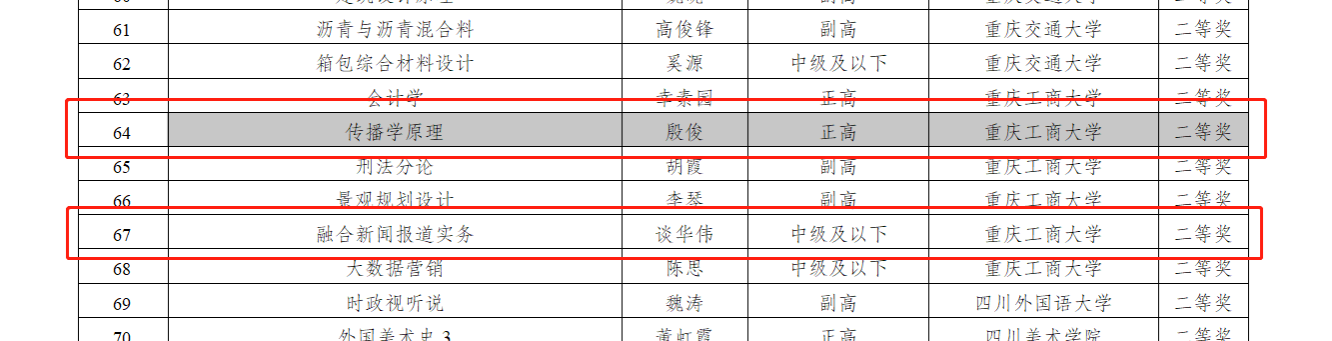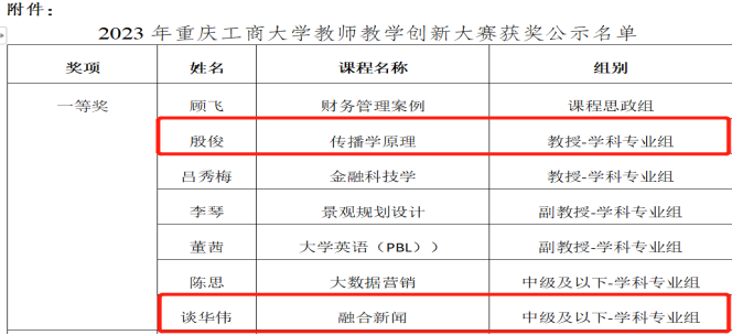 近日在2023年教师教学创新大赛中传来喜讯,我院殷俊院长《传播学原理》课程分别在2023年教师教学创新大赛中获得市级二等奖和学校一等奖。谈华伟博士《融合新闻》分别荣获市级二等奖和学校一等奖。谢云霞博士《重庆文化》、段磊磊博士《传播学经典导论》分别荣获学校课程思政组三等奖。张月月博士《网络传播学》获得学校中级及以下—学科专业组三等奖。